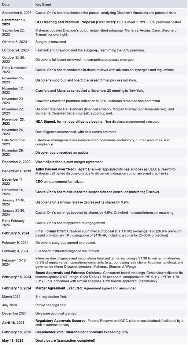 The process accelerated in August 2023: Discover’s CEO resigned on August 14, causing a stock decline. Chairman Thomas Maheras received inquiries, including from Stephen Crawford, an advisor to Capital One CEO Richard Fairbank, around mid-August. This led to a September 13 meeting in New York, where Fairbank proposed a stock-for-stock transaction at a 30% premium. Capital One had engaged Centerview Partners and Wachtell, Lipton, Rosen & Katz by mid-August.