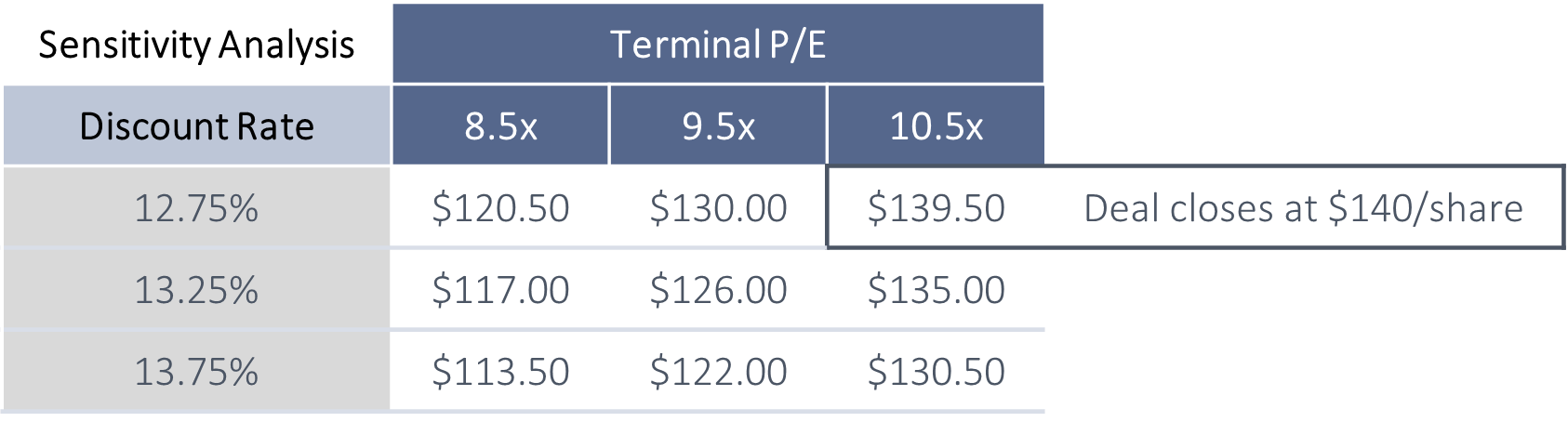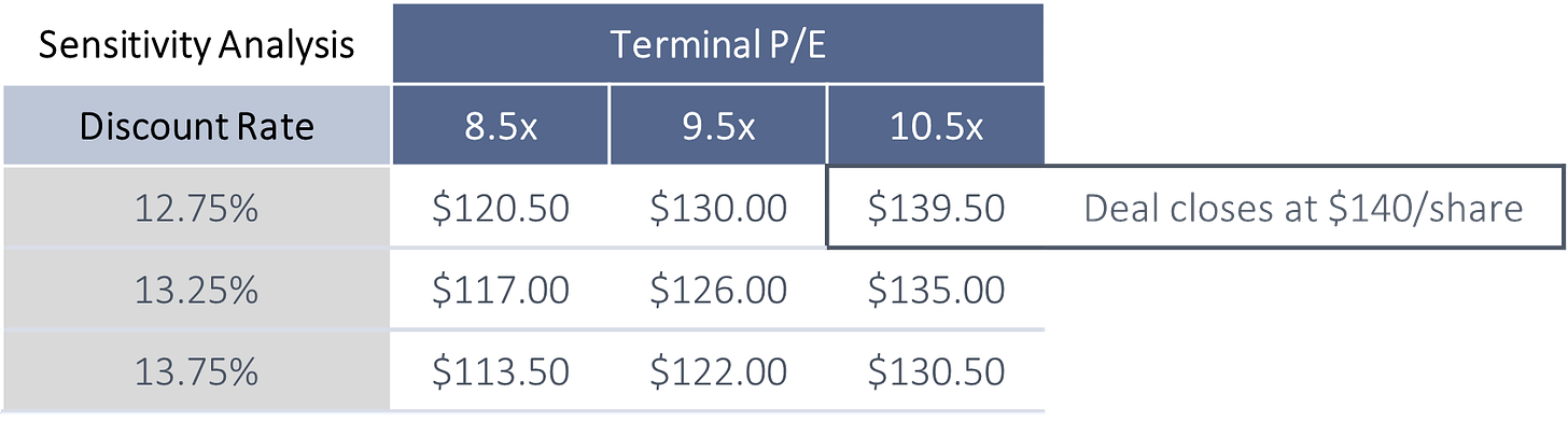 Reviewing the P/E comparables we see overlap with the sensitivity analysis and a rough triangulation approach on the final deal value at a roughly 10.5x P/E. This represented a 27% premium to Discover’s market value at the time of the deal.