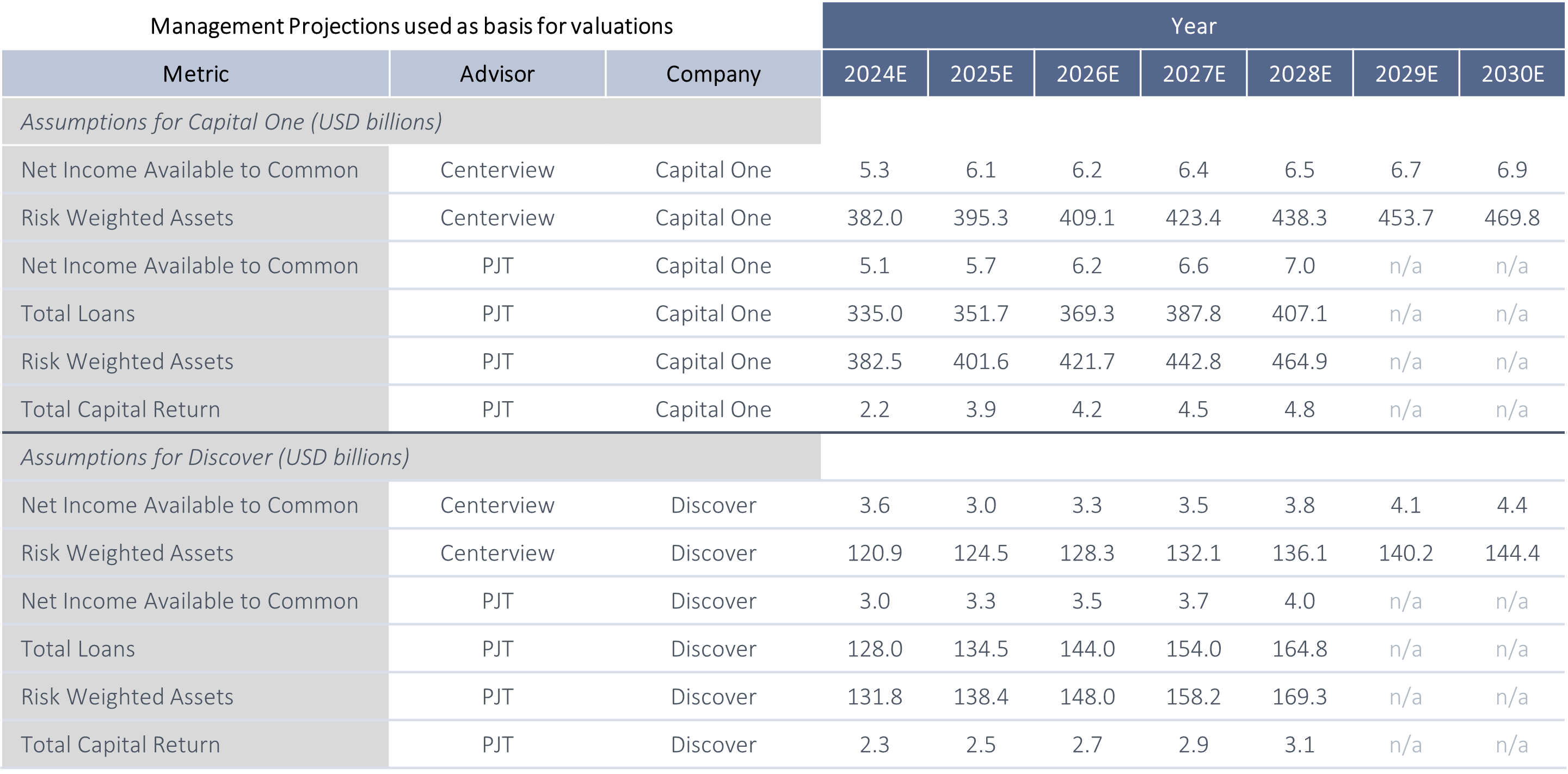 The unaudited prospective financial information formed the core inputs, derived from consensus estimates (e.g., from FactSet or street research) for near-term years (2024-2025) and extrapolated for longer horizons (up to 2030, varying by advisor). These projections included net income available to common shareholders (NIAT), earnings per share (EPS), return on average tangible common equity (ROATCE), tangible book value per share (P/TBV), risk-weighted assets (RWAs), total loans, and total capital returns (e.g., dividends and buybacks). Assumptions reflected steady growth amid economic headwinds, with Capital One targeting CET1 ratios of 13% and Discover 12% for capital adequacy. Synergies were layered on top: $2.7 billion pre-tax by 2027
