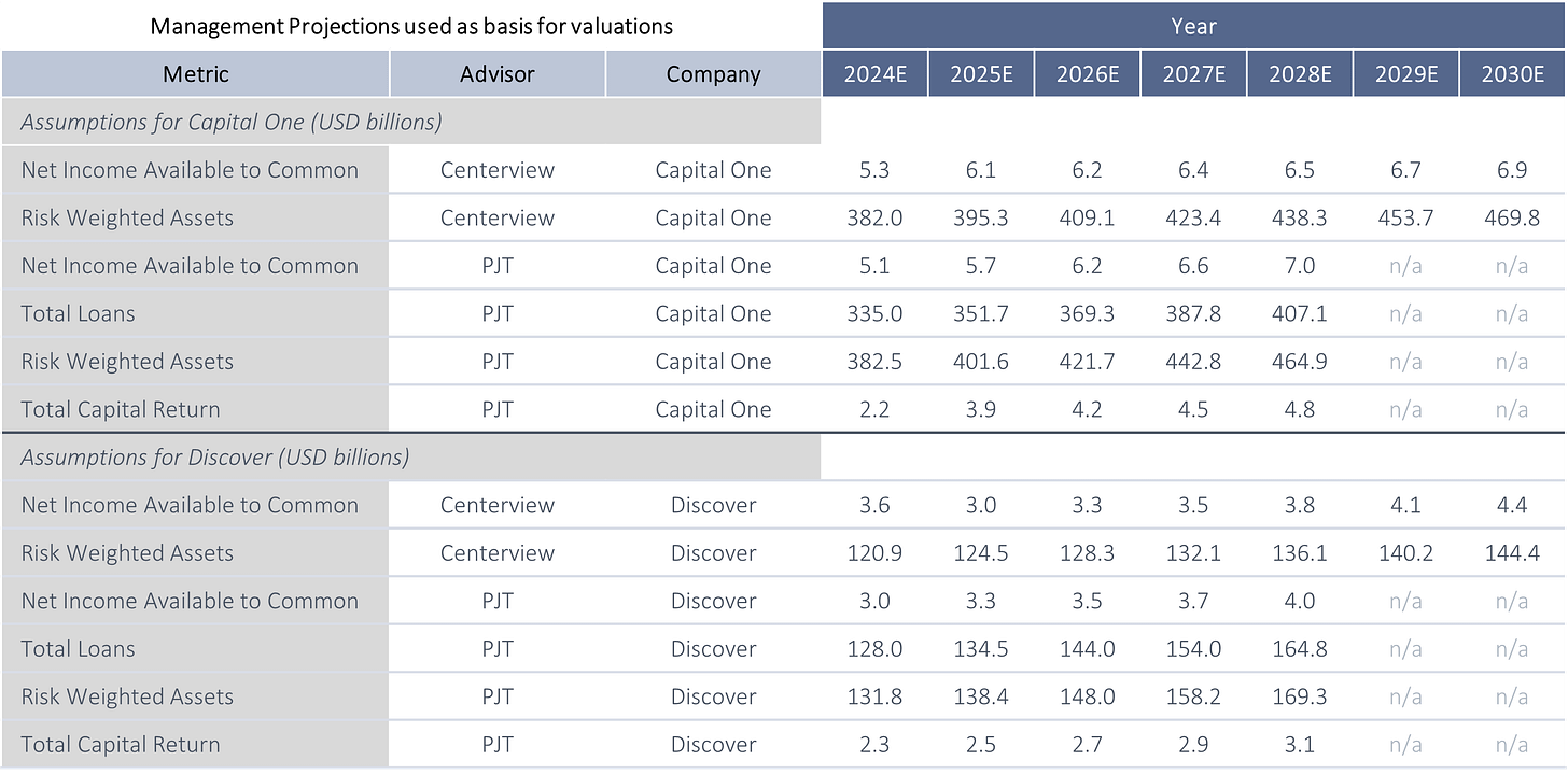 Valuations in this transaction were based on structured analyses by financial advisors Centerview Partners (for Capital One) and PJT Partners (for Discover). These relied on unaudited management projections, emphasizing conservatism amid economic uncertainty. The analyses incorporated standalone forecasts for both companies, adjusted for synergies, and excluded certain one-time items like Discover’s student loan portfolio disposition (implied NPV of ~$7.25 per share, excluded due to uncertainty). Below, we break down the key components into management projections, the dividend discount model (used as a proxy for DCF), and market comparables.