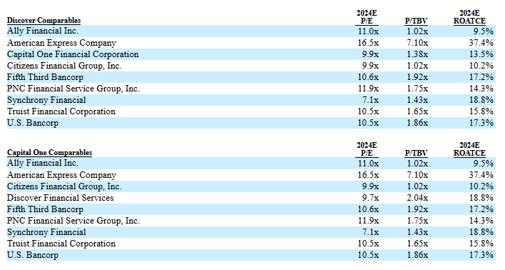 These supported the deal’s premium as aligned with market norms, though critics noted limited fintech inclusion.Centerview’s comparable companies: P/E (9-11x 2024E EPS) and P/TBV (1.78-2.11x via ROATCE regression) for peers like American Express, Ally Financial, Synchrony Financial. Implied Discover ranges: $107.75-$130 (P/E), $103.25-$121 (P/TBV).