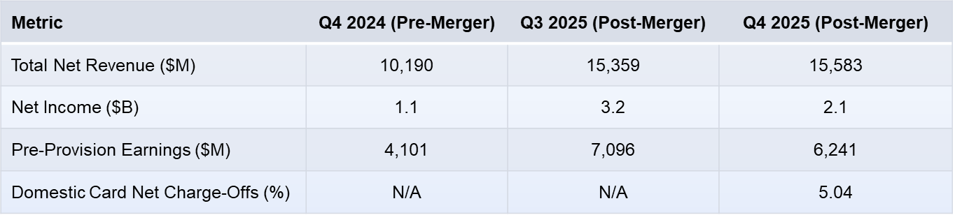 Retrospective analysis highlights resilience: Q3 2025 revenues rose 23%, with synergies advancing (e.g., debit routing implemented early 2026). Yet, Q2’s $4.3 billion loss, cost overruns, and subprime portfolio adjustments underscore challenges. Capital returns via $16 billion buybacks and dividend increases supported shares, but ROE declines indicate ongoing inefficiencies. Credit trends reflect normalization, with charge-offs steady and reserves easing.