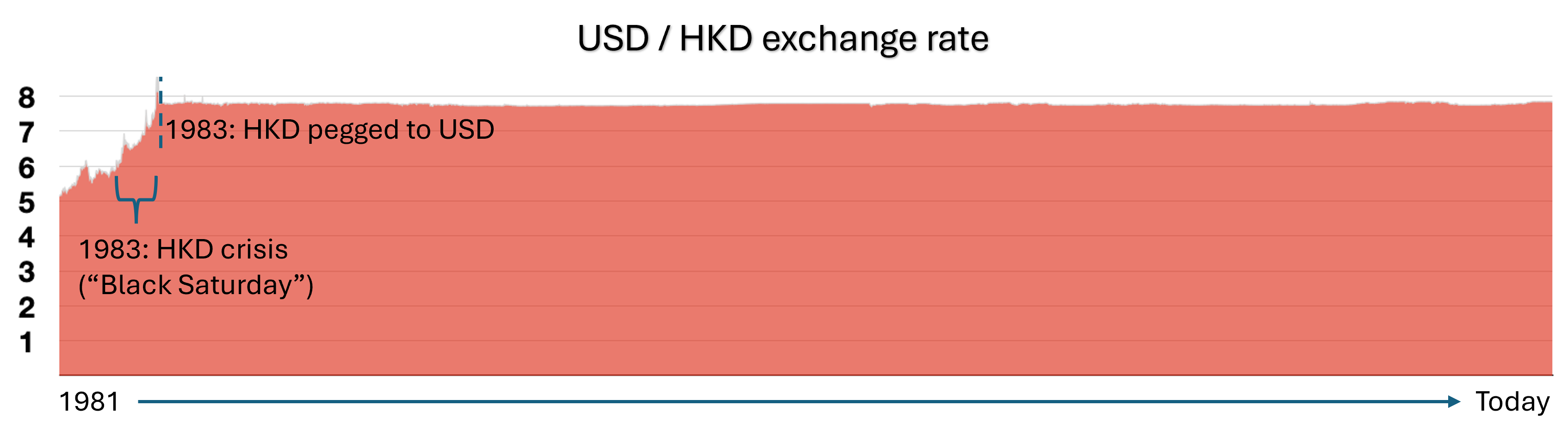 The Hong Kong Dollar has been pegged to the US Dollar (USD) at a fixed exchange rate for over 40 years—a remarkable achievement. This peg was introduced in response to the anxiety and panic surrounding the 1997 handover to China.