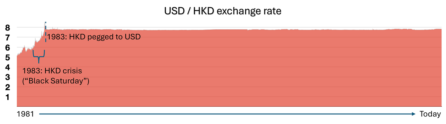 In September 1983, the HKD’s value plummeted over 15% in two days. Merchants began repricing goods in USD, store shelves emptied, and there was a run on essential items. This culminated in the infamous “Black Saturday” on September 24, 1983. Within three weeks, Hong Kong pegged its currency to the USD to restore stability—a peg that has remained intact ever since.