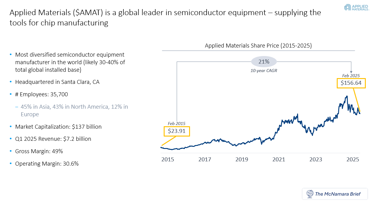 Applied Materials is a global leader in semiconductor equipment. In other words, they make the tools that make semiconductors. When you hear about companies like NVIDIA in the news, they contract out the manufacturing of their semiconductors to “contract manufacturers”. These companies use the tools supplied by Applied Materials to make the chips. This is a highly technical and complex engineering process, requiring AMAT to be embedded with chip manufacturers at each phase of the manufacturing process.